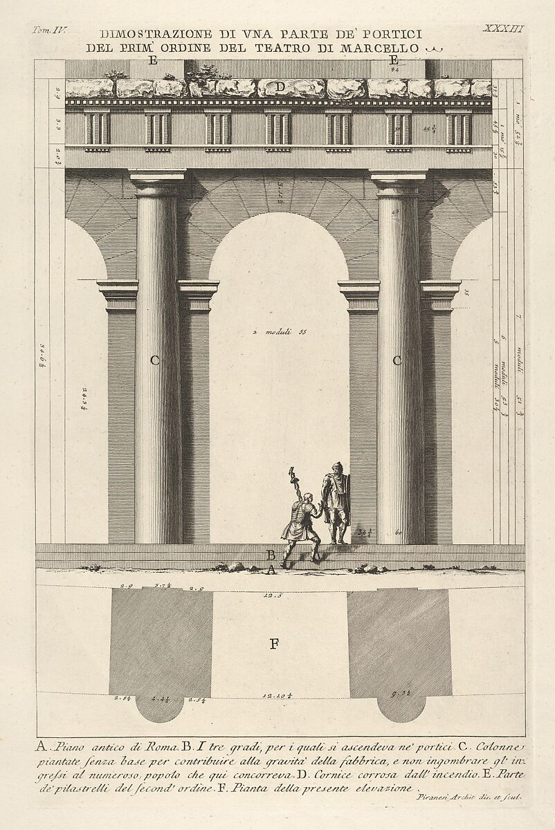 Partial elevation and plan of the first-order portico at the Theater of Marcellus (Dimostrazione di una parte de' portici del prim' ordine del Teatro di Marcello), from "Le Antichità Romane"