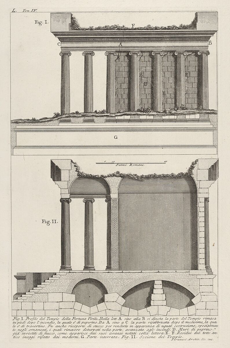 - Title:Profile of the Temple of Fortuna Virilis (Profilo del Tempio della Fortuna Virile), and section of the temple, from "Le Antichità Romane"