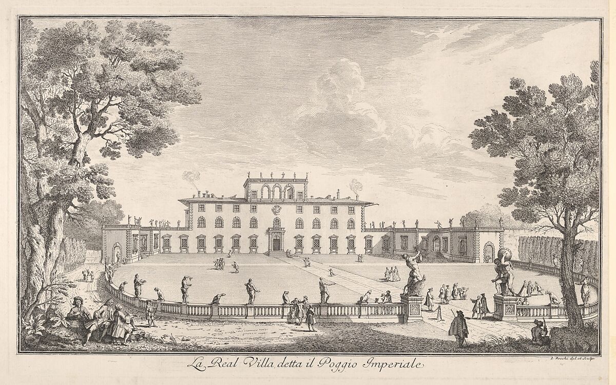 - Title:The Royal Villa called il Poggio Imperiale (La Real Villa detta il Poggio Imperiale), view of the façade and balustrade with statuary, from "Views of the city and other places of Tuscany" (Vedute delle ville e d'altri luoghi della Toscana)