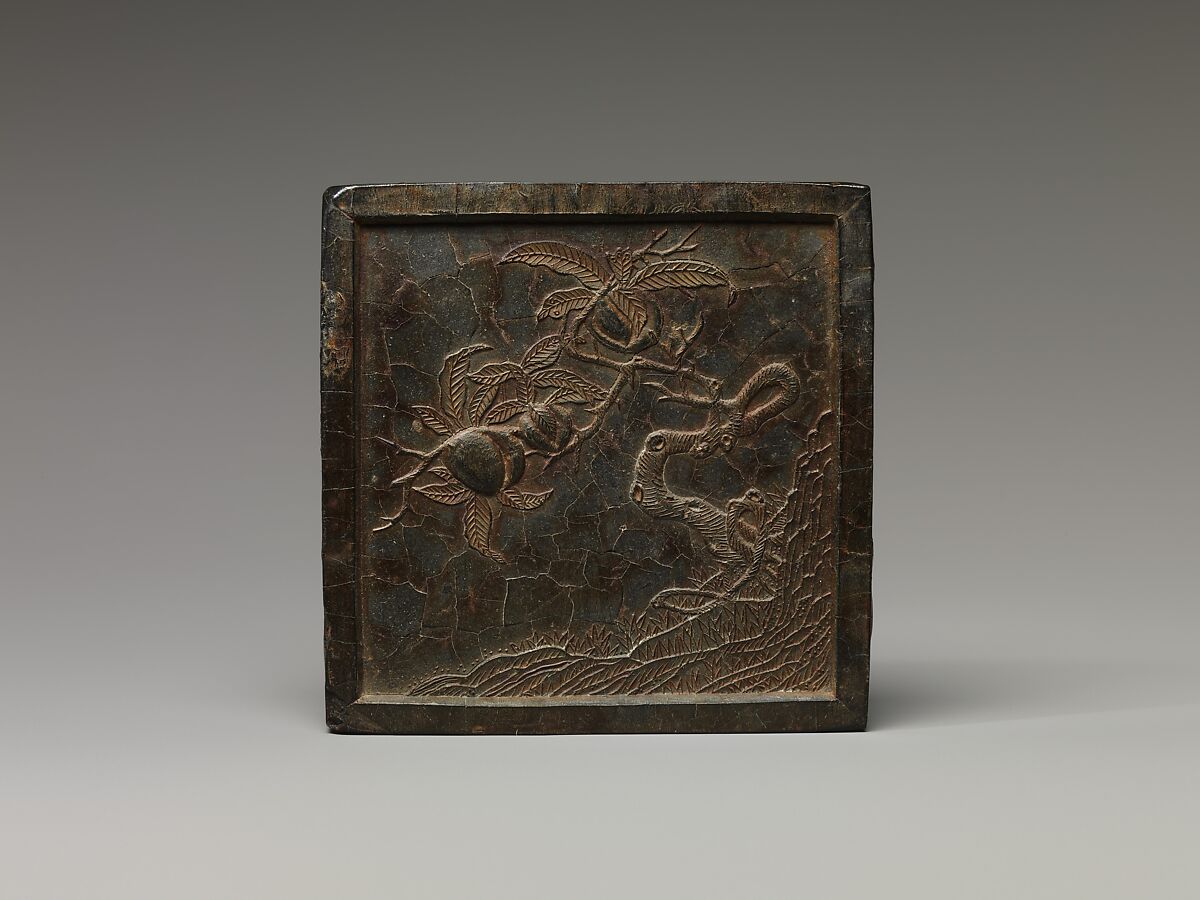 This ink tablet is decorated with a design of a peach tree, symbolic of longevity. An inscription indicates that it was made in 1576 in the workshop of Fang Yulu (active ca. 1570–1619) under the supervision of Cheng Dayue (Cheng Junfang, 1541–ca. 1616), both famous inkmakers