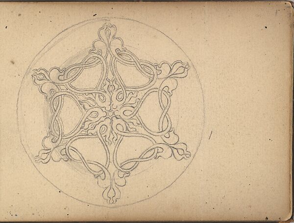 Star-shaped ornament, placed in a circle. The six-pointed star is made up out of organically flowing lines which interlace and connect the six points. The design appears to be suited for a brooch or pendant.