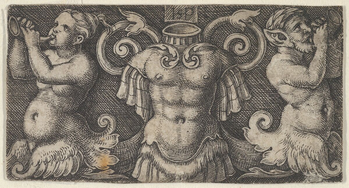 A cuirass at center is flanked by two outward-facing tritons playing instruments.