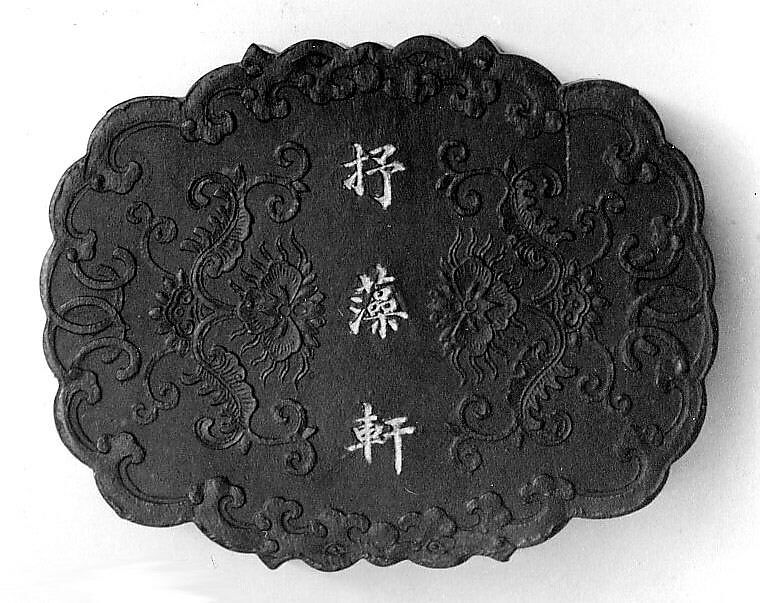 This ink tablet is from a sixty-four-tablet set (30.76.216–.279) commissioned by the Jiaqing emperor from the Studio for Appreciating the Antique (Jiangu Zhai) manufactory of the Wang Jinsheng family in Huizhou, Anhui Province. Each ink tablet commemorates a hall or pavilion in one of the imperial gardens. Each site’s name is written in gilt characters on one side; a view of the site is presented on the other. Such inks were purely decorative and not intended for use.