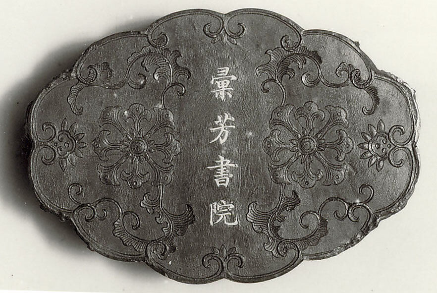 This ink tablet is from a sixty-four-tablet set (30.76.216–.279) commissioned by the Jiaqing emperor from the Studio for Appreciating the Antique (Jiangu Zhai) manufactory of the Wang Jinsheng family in Huizhou, Anhui Province. Each ink tablet commemorates a hall or pavilion in one of the imperial gardens. Each site’s name is written in gilt characters on one side; a view of the site is presented on the other. Such inks were purely decorative and not intended for use.