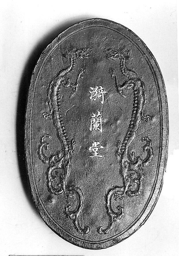 This ink tablet is from a sixty-four-tablet set (30.76.216–.279) commissioned by the Jiaqing emperor from the Studio for Appreciating the Antique (Jiangu Zhai) manufactory of the Wang Jinsheng family in Huizhou, Anhui Province. Each ink tablet commemorates a hall or pavilion in one of the imperial gardens. Each site’s name is written in gilt characters on one side; a view of the site is presented on the other. Such inks were purely decorative and not intended for use.