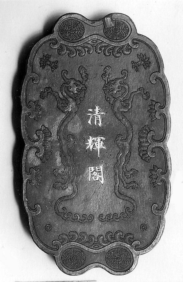 This ink tablet is from a sixty-four-tablet set (30.76.216–.279) commissioned by the Jiaqing emperor from the Studio for Appreciating the Antique (Jiangu Zhai) manufactory of the Wang Jinsheng family in Huizhou, Anhui Province. Each ink tablet commemorates a hall or pavilion in one of the imperial gardens. Each site’s name is written in gilt characters on one side; a view of the site is presented on the other. Such inks were purely decorative and not intended for use.