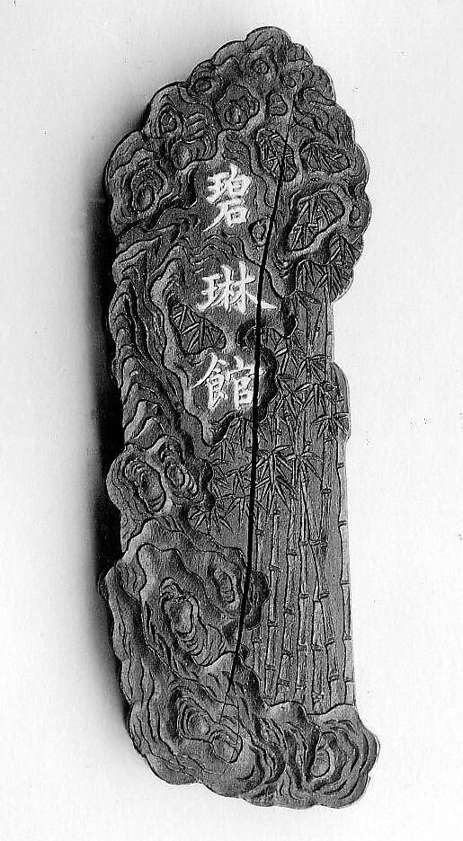 This ink tablet is from a sixty-four-tablet set (30.76.216–.279) commissioned by the Jiaqing emperor from the Studio for Appreciating the Antique (Jiangu Zhai) manufactory of the Wang Jinsheng family in Huizhou, Anhui Province. Each ink tablet commemorates a hall or pavilion in one of the imperial gardens. Each site’s name is written in gilt characters on one side; a view of the site is presented on the other. Such inks were purely decorative and not intended for use.