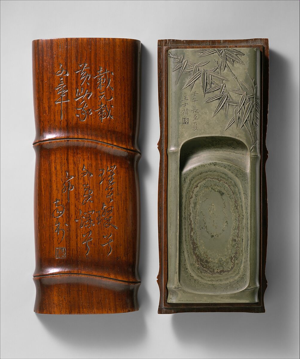 The ink slab and its case bear three inscriptions, which offer clues and raise questions about the work's date. An inscription on the underside of the stone and one on the lid of the box, although signed Qinggong Daoren and Nancun, respectively, both have the same seal, Zuo. While these names are unknown from other sources, they probably denote the same person. The stone's inscription is dated to 1370, which is curiously early, considering the good condition of the box. The third inscription, on the upper side of the slab, comprising eight delicate characters executed in regular script, is dated to the summer solstice of the renwu year (1702), signed Wang Shizhen (1634–1711), a preeminent poet of the early Qing period, and is followed by Wang's seal, Yuan. If this inscription is not a genuine ownership mark by Wang Shizhen, it is likely to have been added either during Wang's time or not long after his death. From 1722 onward, because the character zhen in Wang's name also occurred in the personal name of the newly enthroned Yongzheng emperor (r. 1723–35), the characters of Wang's name were replaced by others that have a similar sound. Since here Wang's name was written in its original form, the inscription was probably carved before 1722.