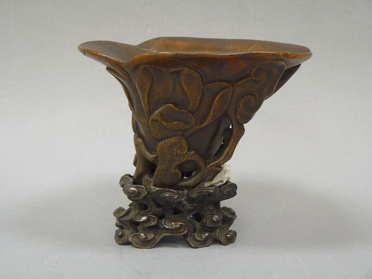 - Medium: Rhinoceros horn, teakwood stand