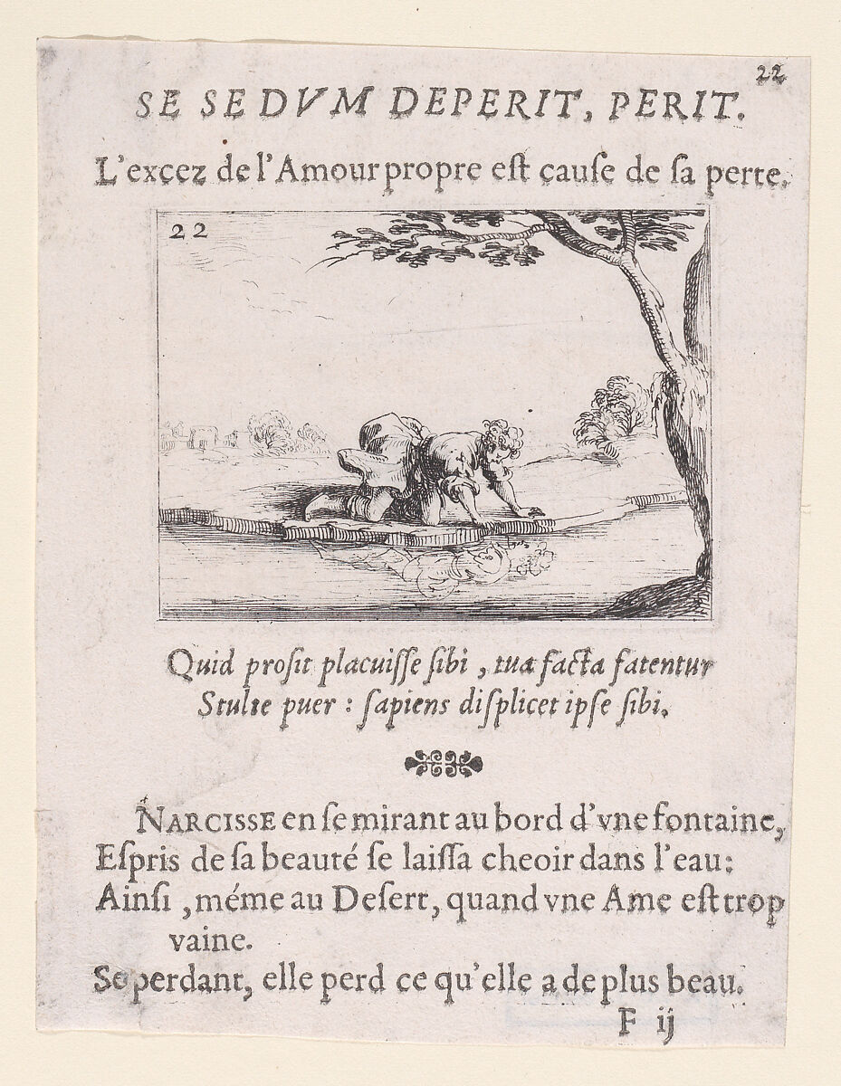 - Title: Narcisse se Mirant dans l'Eau (Narcissus Looking at Himself in the Water), plate 22 from "Lux Claustri ou La Lumière du Cloitre" (The Light of the Cloisters)