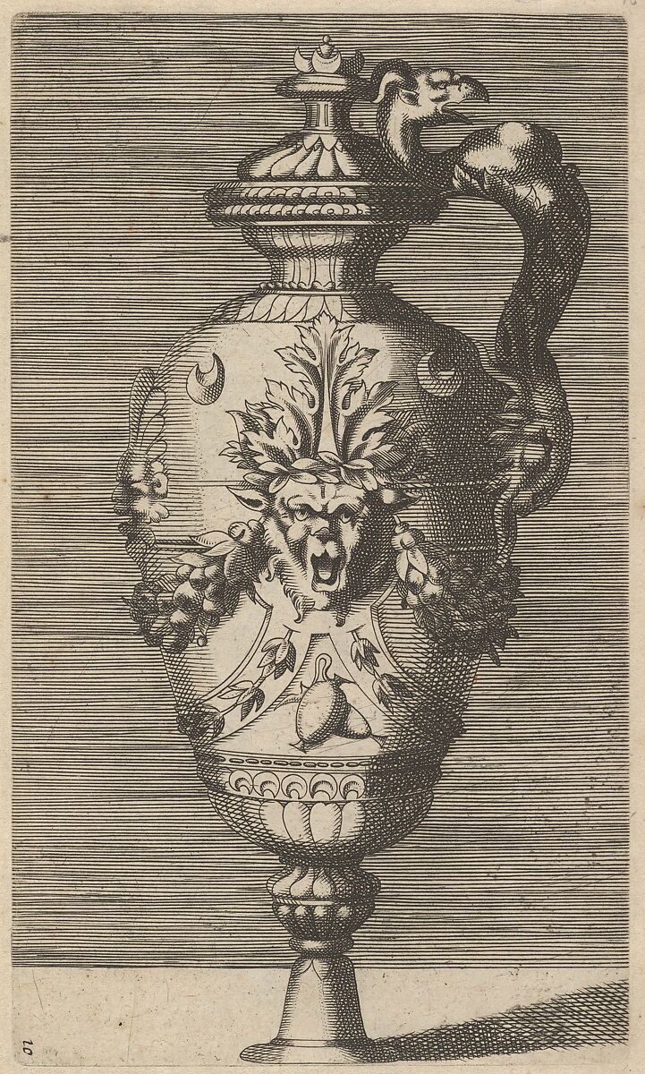 Depiction of a vase or ewer. The vase is covered by a lid and has one handle, shaped like a hybrid bird-like creature. The body of the vase is decorated with a satyr-like mask from whose ears two garlands spring forth. The print is part of a series of 12 vases said to be designed by Rosso Fiorentino and Polidoro da Caravaggio and initially engraved and published by René Boyvin. The current series was first published by Claes Jansz. Visscher in the early seventeenth century and subsequently also by Frederik de Wit.