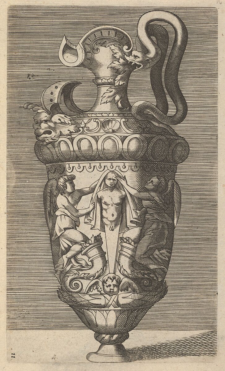 Depiction of a vase or ewer. The vase is covered by a lid and has one handle, shaped like a hybrid bird-like creature. The body of the vase is decorated with a satyr-like mask from whose ears two garlands spring forth. The print is part of a series of 12 vases said to be designed by Rosso Fiorentino and Polidoro da Caravaggio and initially engraved and published by René Boyvin. The current series was first published by Claes Jansz. Visscher in the early seventeenth century and subsequently also by Frederik de Wit.