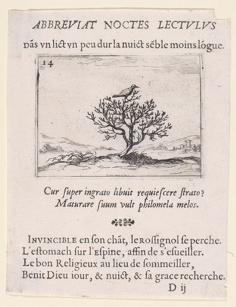 - Title: Le Rossignol Posé sur un Buisson (A Nightengale Standing on a Bush), plate 14 from "Lux Claustri ou La Lumière du Cloitre" (The Light of the Cloisters)