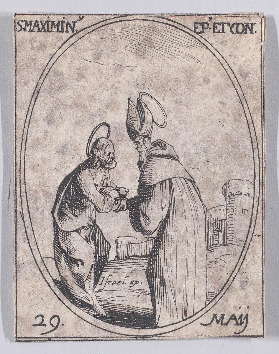 - Title:S. Maximin, évêque et confesseur (St. Maximinus, Bishop and Confessor), May 29th, from "Les Images De Tous Les Saincts et Saintes de L'Année" (Images of All of the Saints and Religious Events of the Year)