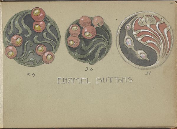 Three designs for enamel buttons in red, green, gold and silver. The first two designs show plant motifs on a blackground. The plants red berries or flowers with a gilt center. The third design is silver and divided into two fields like a ying yang sign, one in black and one in red. It has a silver flower meandering across the red field and a string with three precious stones across the black half.