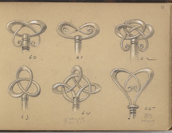 Six designs for key grips, all made up out of interlacing straps reminiscent of Celtic patterns. The designs are individually numbered and also signed and dated by Simpson.