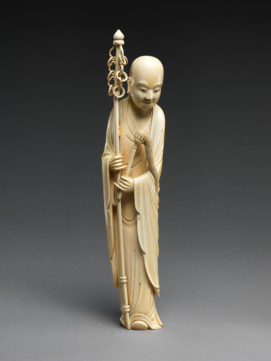 This figure is an arhat (luohan), a protector of the Buddhist faith and an exemplar for practitioners. Buddhist imagery plays an important role in Chinese decorative arts, and arhats are a popular subject.