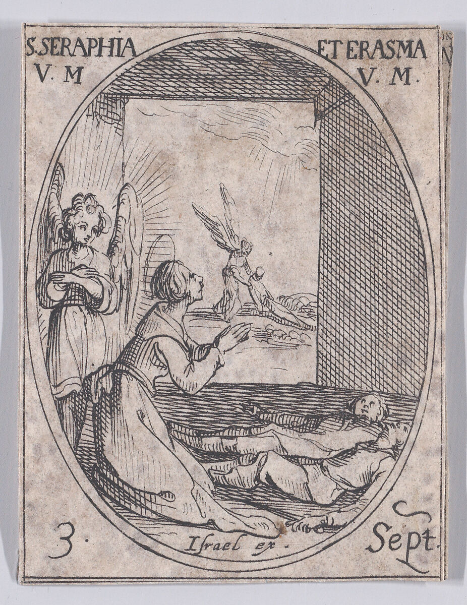 - Title:Ste. Séraphie et Ste. Erasme, vierges et martyres (St. Seraphia and St. Erasma, Virgins and Martyrs), September 3rd, from "Les Images De Tous Les Saincts et Saintes de L'Année" (Images of All of the Saints and Religious Events of the Year)