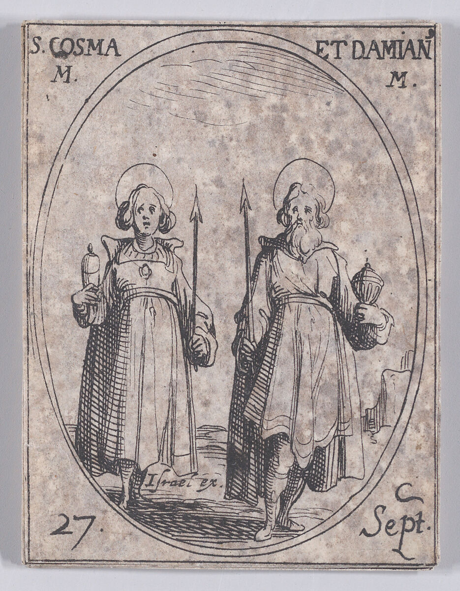 - Title:S. Cosme et S. Damien, martyrs (St. Cosmas and St. Damian, Martyrs), September 27th, from "Les Images De Tous Les Saincts et Saintes de L'Année" (Images of All of the Saints and Religious Events of the Year)