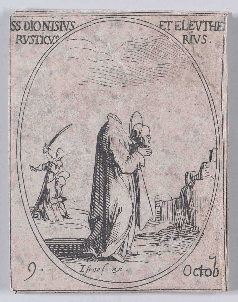 - Title: S. Denis, S. Rustique et S. Eleuthère (St. Denis, St. Rusticus, and St. Eleutherius), October 9th, from "Les Images De Tous Les Saincts et Saintes de L'Année" (Images of All of the Saints and Religious Events of the Year)