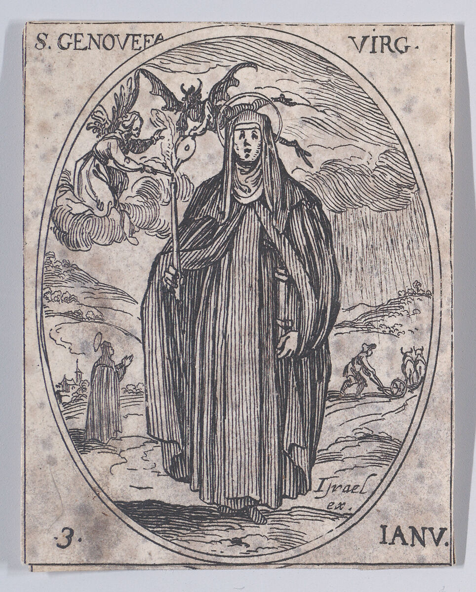 - Title:Ste. Geneviève, vierge (St. Genevieve, Virgin), January 3rd, from "Les Images De Tous Les Saincts et Saintes de L'Année" (Images of All of the Saints and Feast Days of the Year)
