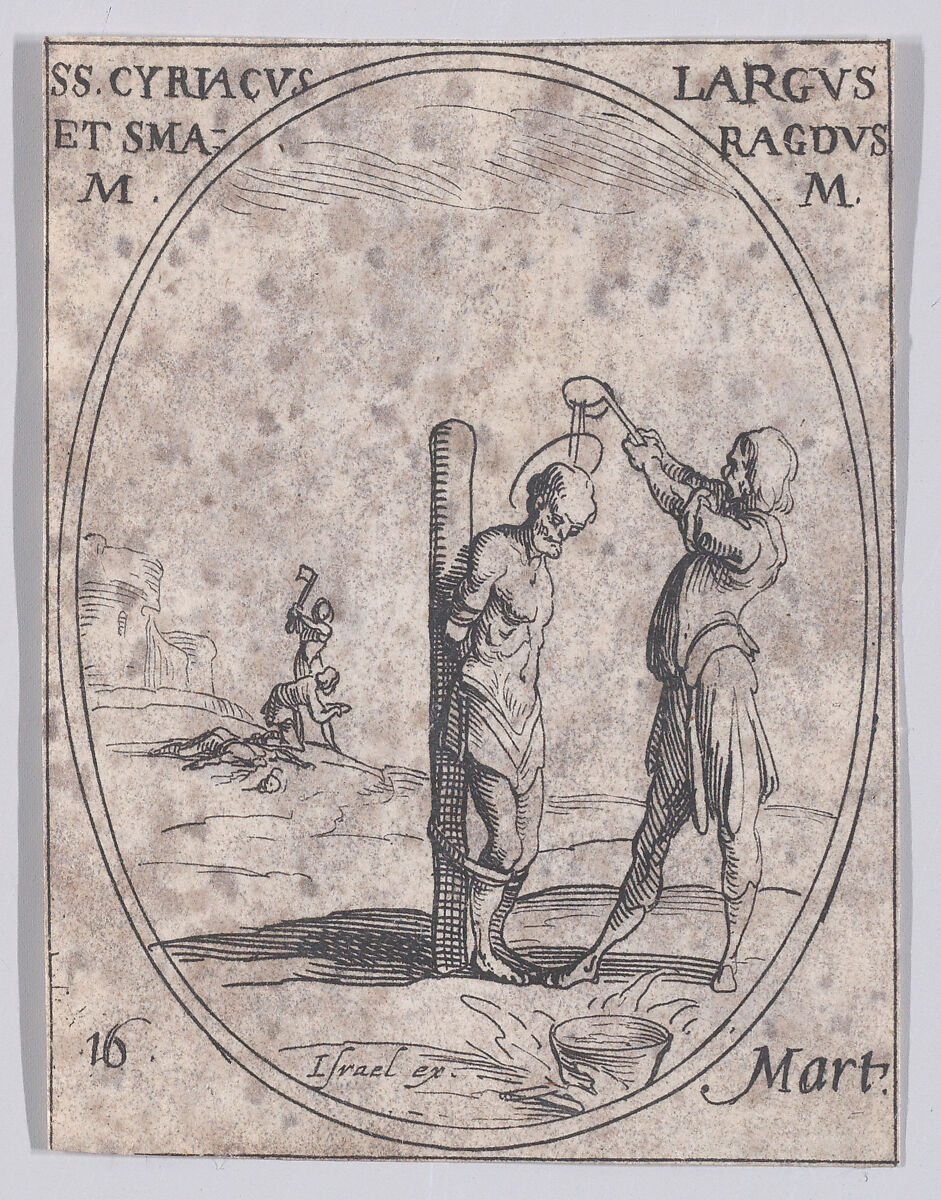 - Title:S. Cyriaque, S. Large et S. Smaragde (St. Cyriacus, St. Largus, and St. Smaragdus), March 16th, from "Les Images De Tous Les Saincts et Saintes de L'Année" (Images of All of the Saints and Religious Events of the Year)