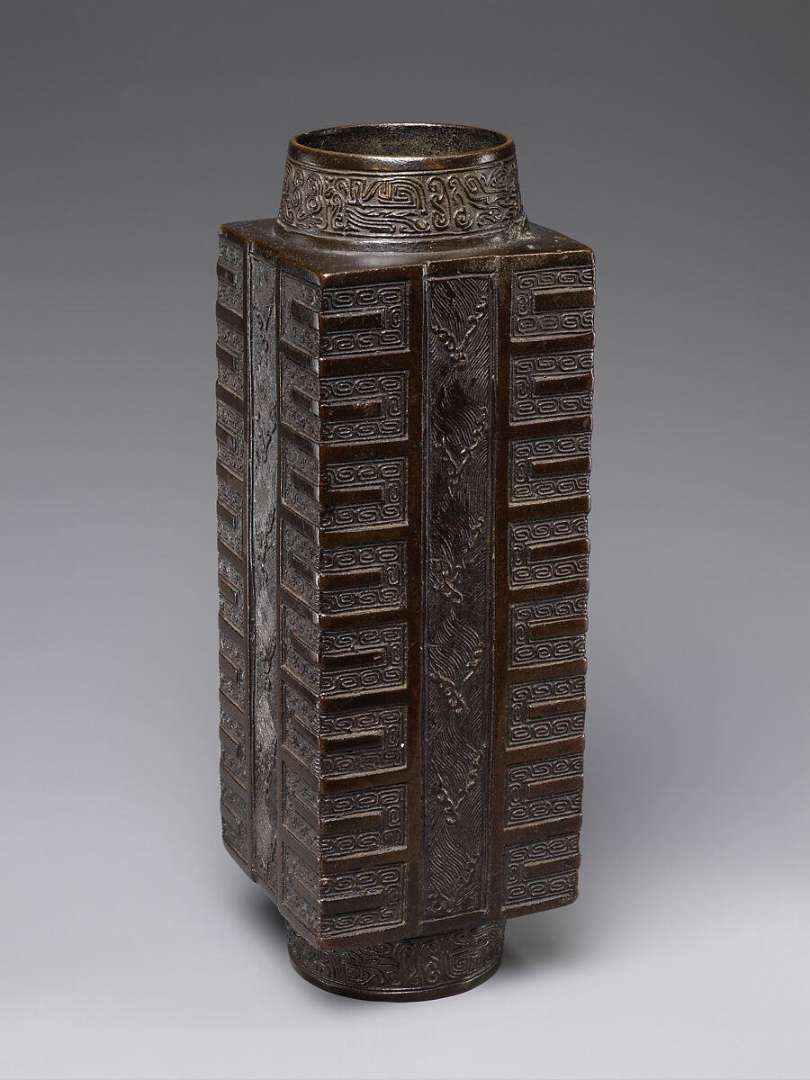 By the thirteenth century, the jade cong form was reinterpreted as a flower vase in both bronze and ceramic art. In contrast to the subtle celadon glaze on ceramic vases, bronze vases are filled with archaic squared spirals as well as contemporaneous motifs such as waves and scrolling patterns.