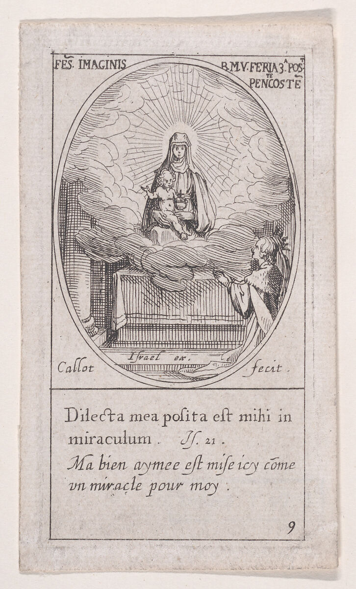 La Vierge et l'Enfant Jésus apparaissent au milieu d'un nuage sur un autel au pied duquel un reine est agenouillée en prières, au bas à droite (The Virgin and Christ Child Seated Amidst Clouds on an Altar, beneath which a Queen Kneels in Prayer at Lower Right), Third Sunday after Pentecost, scene 9 from Images des Fêtes Mobiles (Images of Moveable Feasts from the Christian Calendar), part of "Les Images De Tous Les Saincts et Saintes de L'Année" (Images of All of the Saints and Religious Events of the Year)