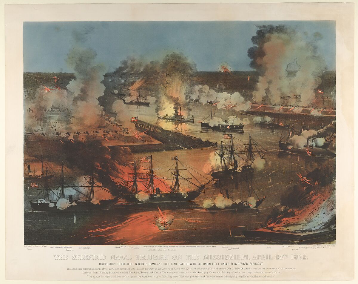 In April 1861, at the start of the American Civil War, President Abraham Lincoln declared a blockade of Southern ports; gaining control of the Mississippi River and Confederate trade benefiting Southern states were key Union goals. This print records a decisive Northern assault, known as the Battle of Forts Jackson and St. Philip, which took place in April 1862; these two strategically located forts guarded the mouth of the Mississippi. Six days of mortar bombardment, followed by fierce naval combat, forced the damaged Forts Jackson and Saint Philip to surrender. Union Flag Officer David Farragut then advanced his fleet upriver to capture New Orleans, the Confederacy’s largest city and chief port.