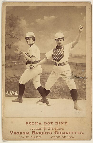 Cabinet card photographs issued as advertising cards for the series "Cabinet Photos, Allen & Ginter" (H807), issued in the mid-1880s to promote Allen & Ginter cigarette brands. There are four types of cards in the series: Type 1 cards are labeled "Black Stocking Nine"; Type 2 cards depict the "Polka Dot Nine"; Type 3 cards are titled "Girl Cyclists"; and Type 4 cards represent "Yacht Club Contestants".