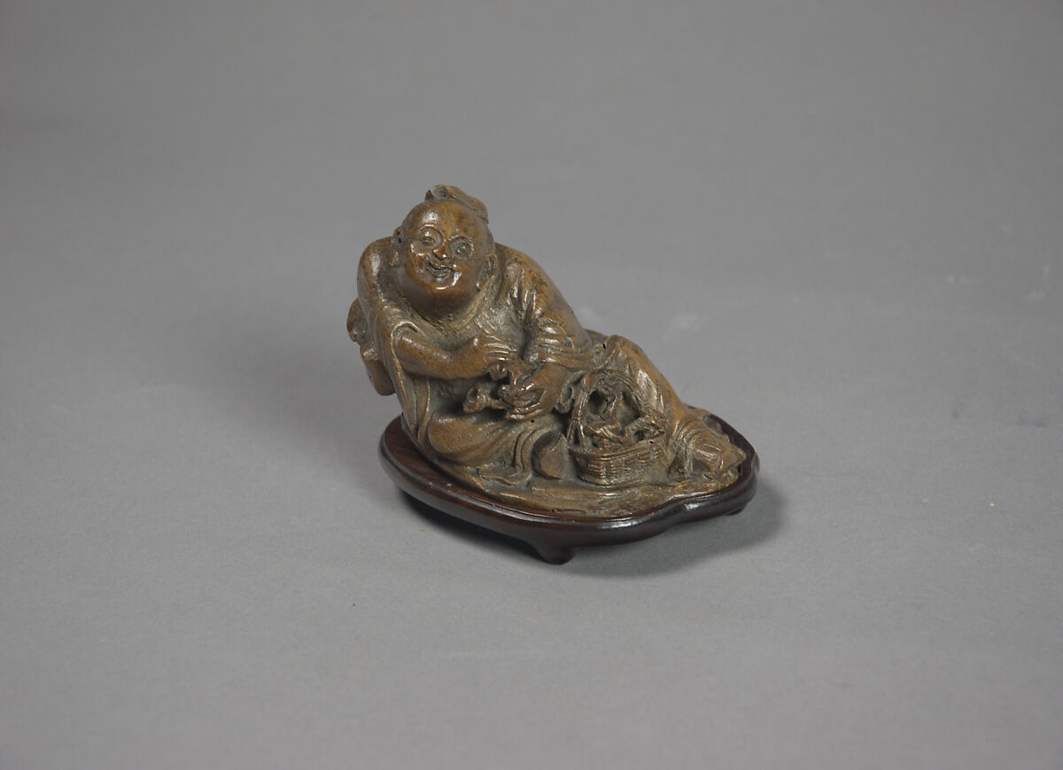 The child’s basket contains lingzhi (cloud-like mushrooms), symbols of immortality and good wishes, which imply the figure is an immortal.