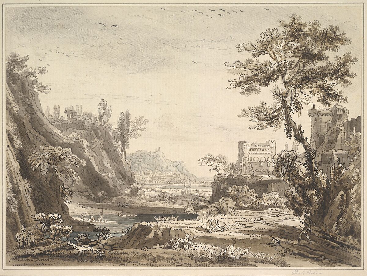 One of the finest imaginative draftsmen working in London in the mid-eighteenth century, Chatelain was also a skilled etcher. This classically composed landscape is executed mostly in ink and brown wash, with blue touches applied to the water and a distant hill. A central river leads the eye to a distant bay, framed by a large large tree at right and a series of steep receding cliffs at left. The artist's admiration for the French landscape painter Claude is evident, and it is not surprising that Chatelain worked with Francis Vivares to produce one of the first prints after Claude to be published in England ("A Dance Under the Trees", or "Landscape with Rural Dance," 1743).