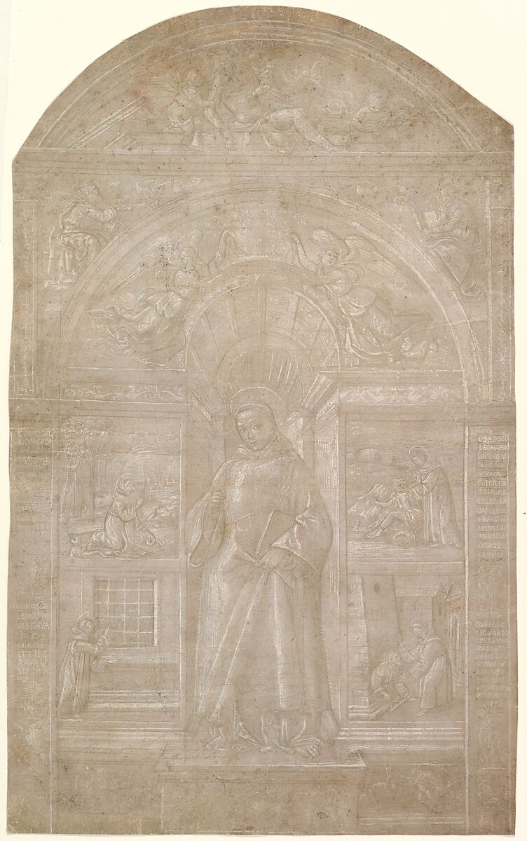- Medium: Metalpoint, brush and pale brown wash, highlighted with cream gouache, over incised compass and ruler constructions, on gray-brownish prepared paper