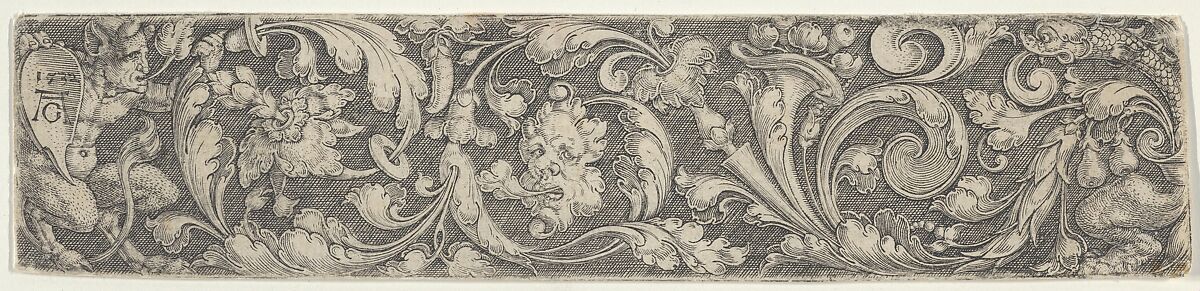 Ornamental design showing a crouching satyr at far left bearing a shield with the artist's monogram and the date. The foliate scrollwork to the satyr's right is inhabited with a mask (at center) and a fish (at right).