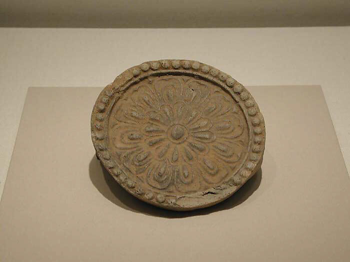 The lotus-petal motif, a symbol of Buddhism, adorns this tile, which would have capped off a row of tiles and lined up with other endpieces to form the eaves of a building. The Samguk Yusa (Memorabilla of the Three Kingdoms), one of the two earliest surviving histories of the Korean peninsula, informs us that the capital city of the Unified Silla, Gyeongju, was so prosperous that all of the dwellings, not just the residences of the nobility, had roofs of tile.