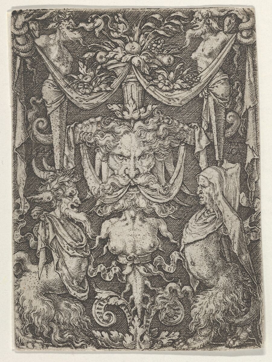 Ornamental design panel with mask at center, flanked by two satyrs. The date is located above the head of the bearded satyr at left, and the artist's monogram is located above the head of the satyr at right.