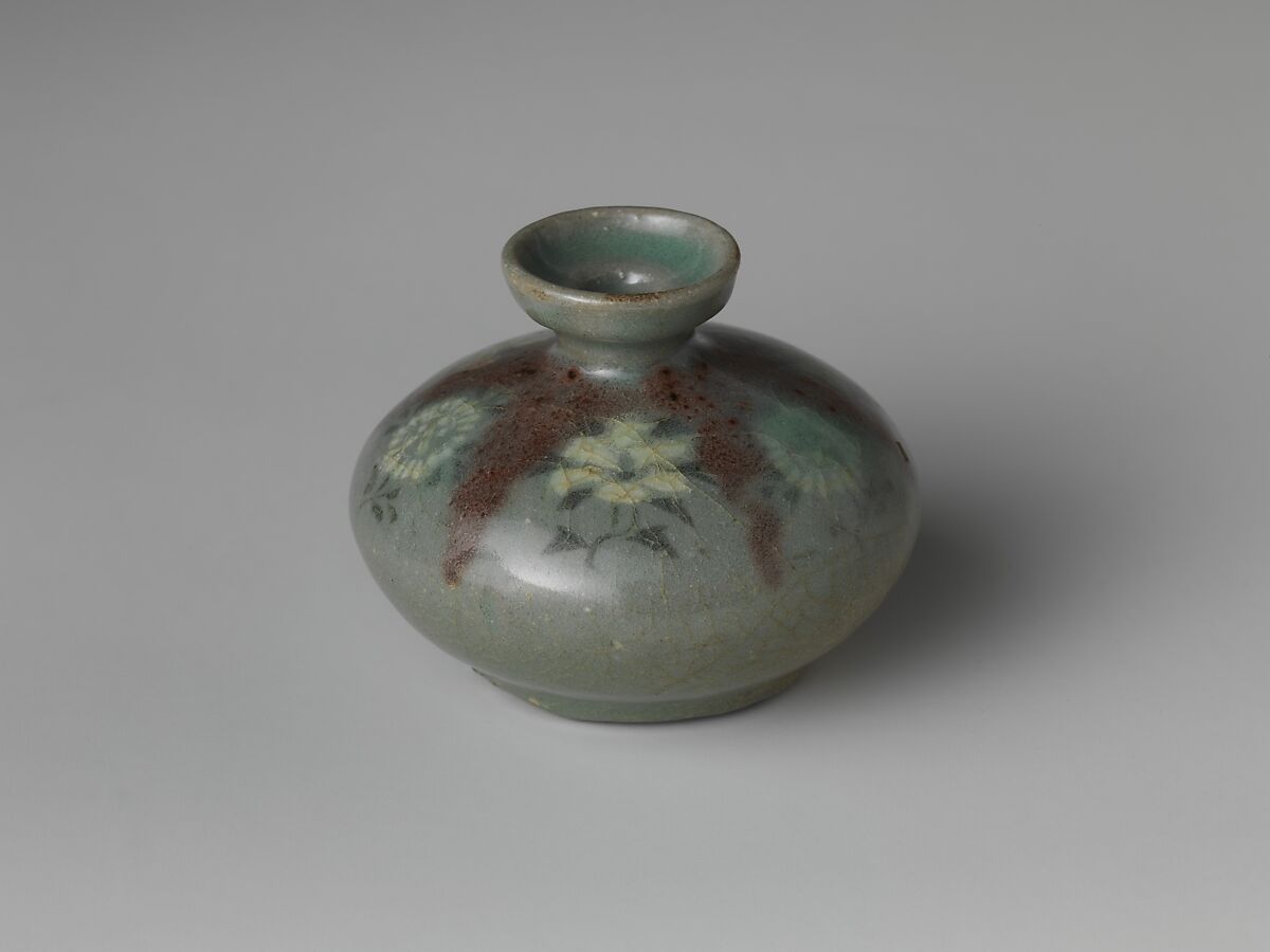 Volatile copper-red pigment was successfully controlled during this bottle’s firing to produce splashes of deep crimson against the black-and-white inlay and green glaze—a technique that was likely an innovation of Goryeo potters.