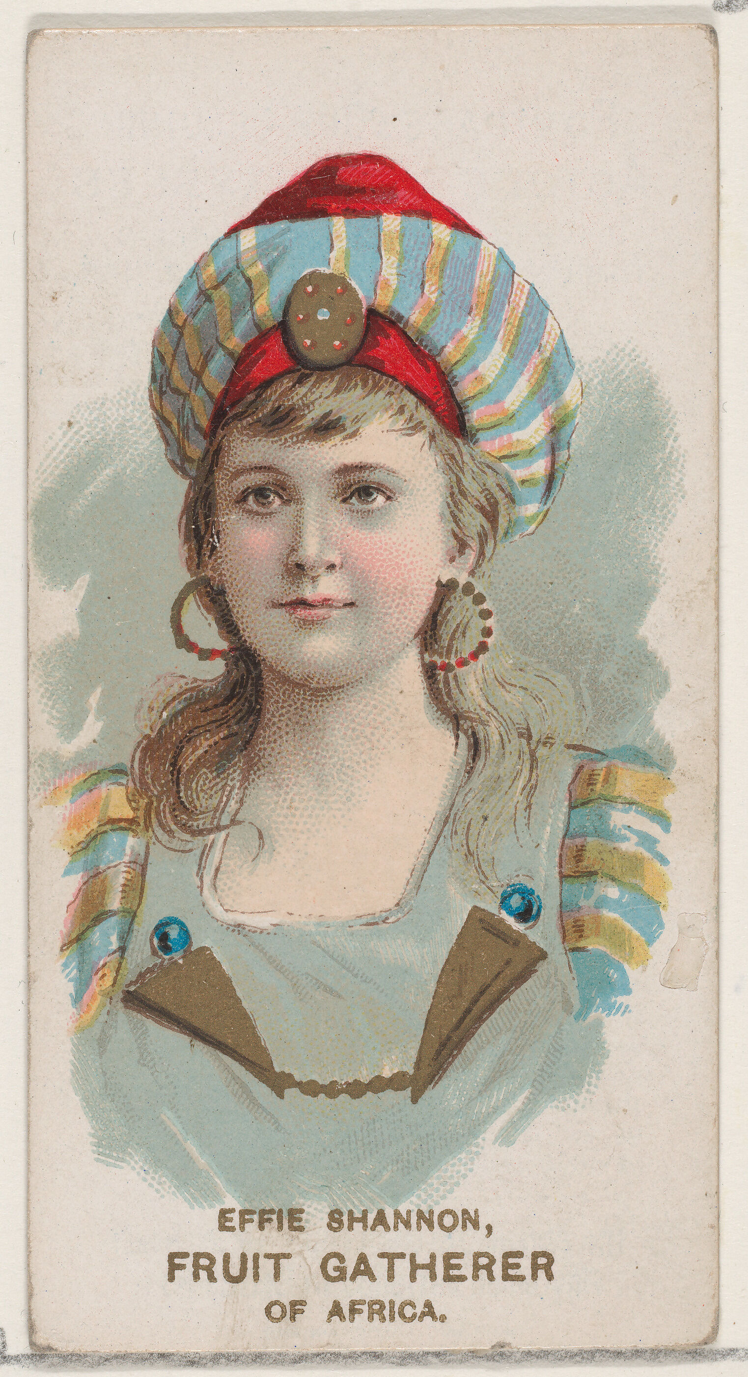 - Title:Effie Shannon Dressed as Fruit Gatherer of Africa, from the set Actors and Actresses, Second Series (N71) for Duke brand cigarettes