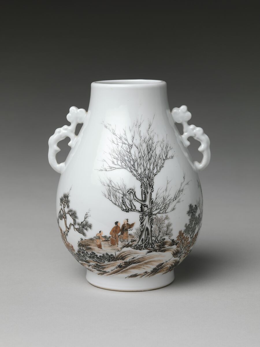 This pair of vases (with 68.4.2) have mirror-image designs that have been painted over the glaze in sepia and black pigments with minute attention to detail. They are marked on the base with Yuan Shikai's reign title, Hongxian, and they stand as proof of a degree of excellence in ceramic manufacture that is generally unexpected in wares of this period.