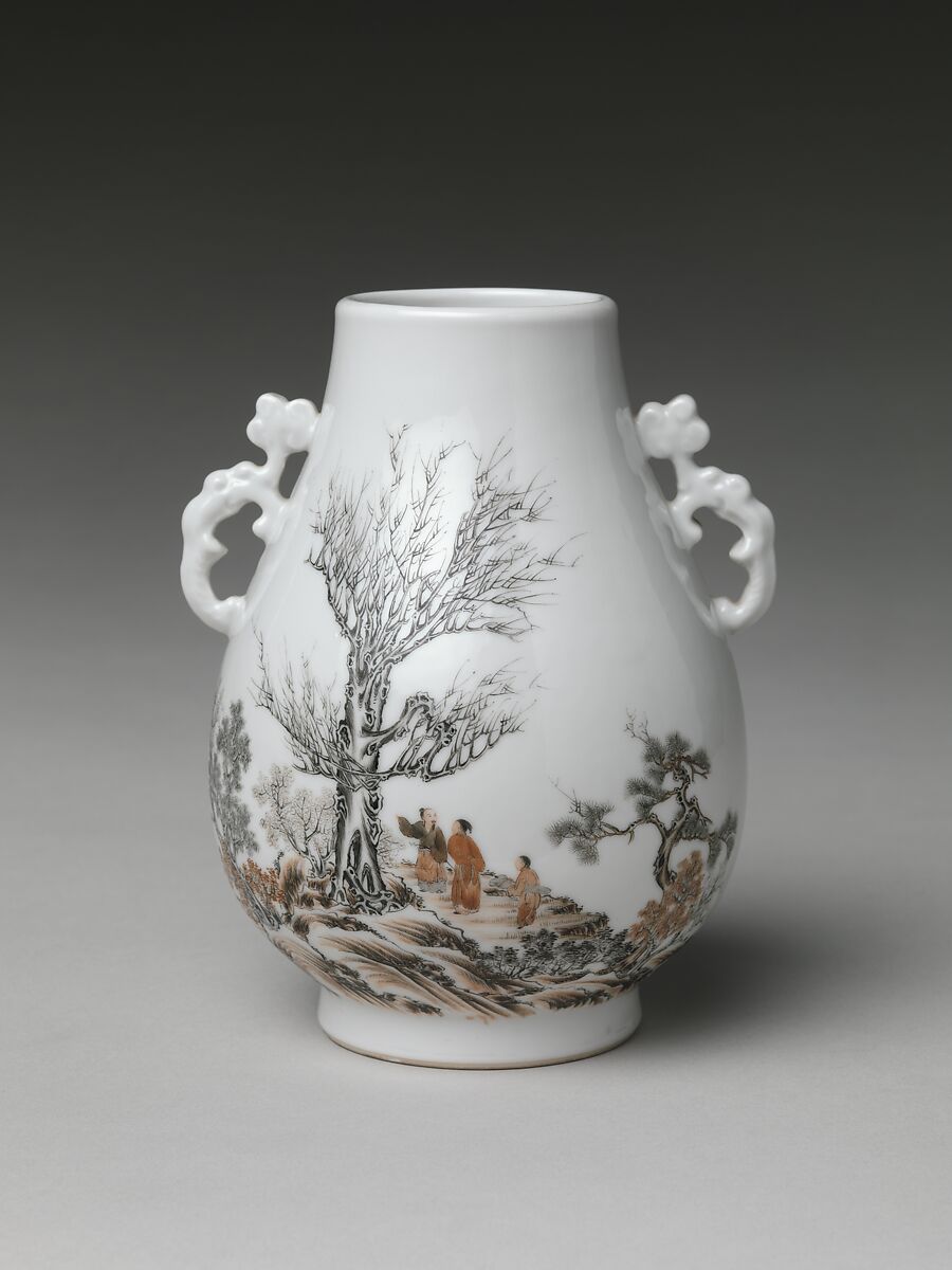 This pair of vases (with 68.4.1) have mirror-image designs that have been painted over the glaze in sepia and black pigments with minute attention to detail. They are marked on the base with Yuan Shikai's reign title, Hongxian, and they stand as proof of a degree of excellence in ceramic manufacture that is generally unexpected in wares of this period.
