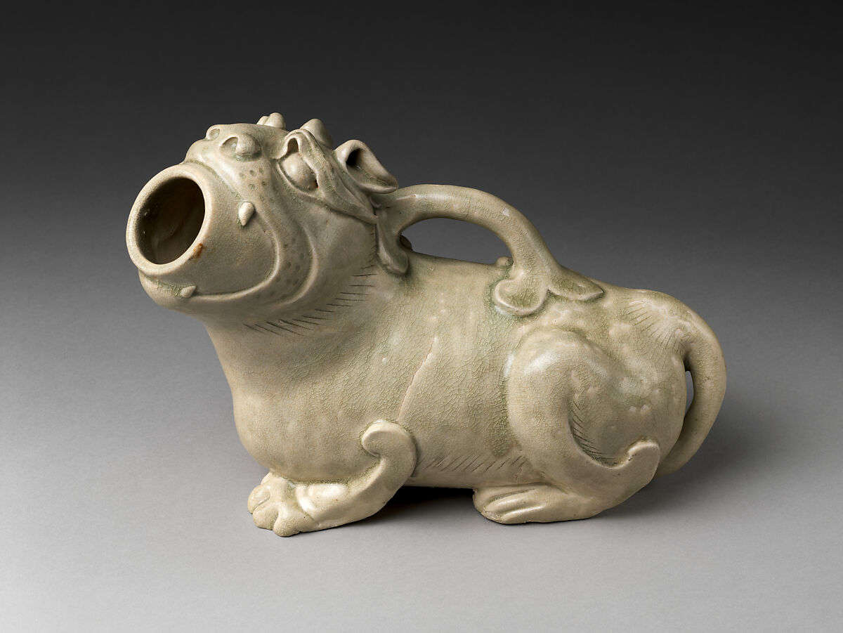 Fanciful vessels such as this were produced primarily in south China; however, examples in both clay and bronze have been found in the north as well. The shape has a long history and was first produced in the second and third centuries for pouring liquids.