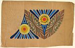 Horizontal Pattern with Decorative Blue Fans and Metallic Shields, from a group of 158 textile designs from an unidentified French designer. The designs include brightly colored patterns and single motifs in late Art Nouveau and Art Deco styles. Most designs have been made on tracing paper and show signs of transfer. Some include instructions for execution, written in French.