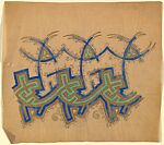 Pattern with Design Derived from Gothic Tracery at Bottom and Repetitive Angular Design Above, from a group of 158 textile designs from an unidentified French designer. The designs include brightly colored patterns and single motifs in late Art Nouveau and Art Deco styles. Most designs have been made on tracing paper and show signs of transfer. Some include instructions for execution, written in French.