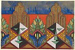 Horizontal Panel with Black and White Stilized Masks Combined with Palmettes from a group of 158 textile designs from an unidentified French designer. The designs include brightly colored patterns and single motifs in late Art Nouveau and Art Deco styles. Most designs have been made on tracing paper and show signs of transfer. Some include instructions for execution, written in French.