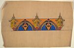 Horizontal Panel with a Masked Figure Wearing an Arched Headdress Between Buildings, from a group of 158 textile designs from an unidentified French designer. The designs include brightly colored patterns and single motifs in late Art Nouveau and Art Deco styles. Most designs have been made on tracing paper and show signs of transfer. Some include instructions for execution, written in French.