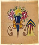 Frieze with Ornamental Bracket Holding a Vase with Floral Arrangement, from a group of 158 textile designs from an unidentified French designer. The designs include brightly colored patterns and single motifs in late Art Nouveau and Art Deco styles. Most designs have been made on tracing paper and show signs of transfer. Some include instructions for execution, written in French.