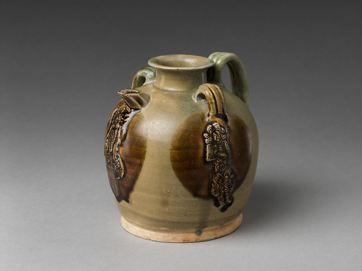 The curly hair of the dancer appliqued to the ewer suggests that this figure is not of Chinese ethnicity. He may represent a South or Southeast Asian individual, or even someone from Central Asia. Similar dancing figures, depicted on ceramics from north China, often represent Sogdians, a trading people based in present-day Uzbekistan, known for their whirling dances.
