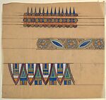 Three Sections of Friezes, with a Pattern of Purple Arches at Top, from a group of 158 textile designs from an unidentified French designer. The designs include brightly colored patterns and single motifs in late Art Nouveau and Art Deco styles. Most designs have been made on tracing paper and show signs of transfer. Some include instructions for execution, written in French.