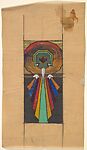 Vertical Panel Divided into Two Rectangular Sections, with a Multi-Colored Fan on a Gray Background at Top, from a group of 158 textile designs from an unidentified French designer. The designs include brightly colored patterns and single motifs in late Art Nouveau and Art Deco styles. Most designs have been made on tracing paper and show signs of transfer. Some include instructions for execution, written in French.