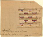 Panel with a Pattern of Multi-Colored T-Shaped Designs on Rows of Gold Lines, from a group of 158 textile designs from an unidentified French designer. The designs include brightly colored patterns and single motifs in late Art Nouveau and Art Deco styles. Most designs have been made on tracing paper and show signs of transfer. Some include instructions for execution, written in French.